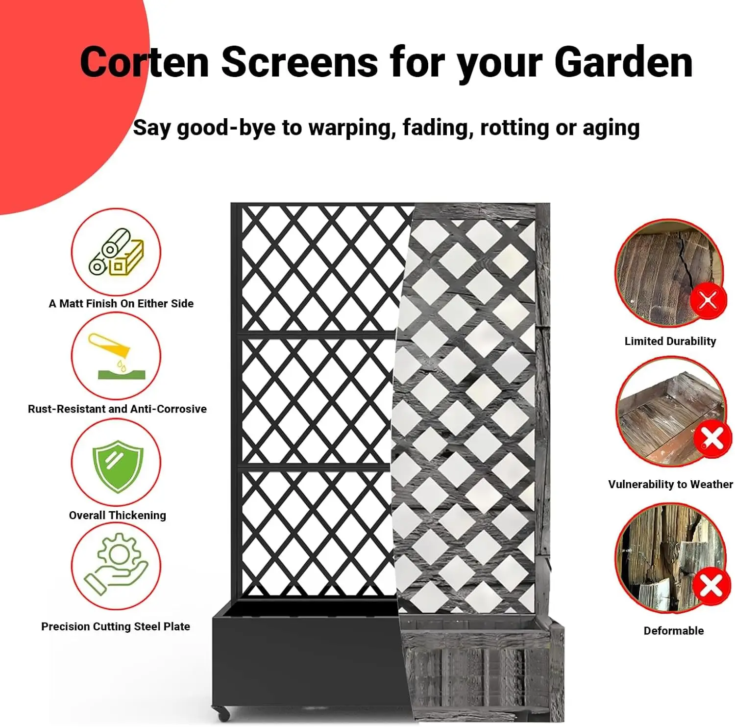 【Rust Resistant Raised Garden Bed】This planter box features a precision-carved trellis frame design, combining detailed craftsmanship with rust-resistant durability. These outdoor privacy planter are designed to beautify courtyards, ensuring rust resistant, long-lasting durability with minimal maintenance. Perfect for adding both beauty and functionality to your garden or patio décor, this privacy screen is a must-have for outdoor space.