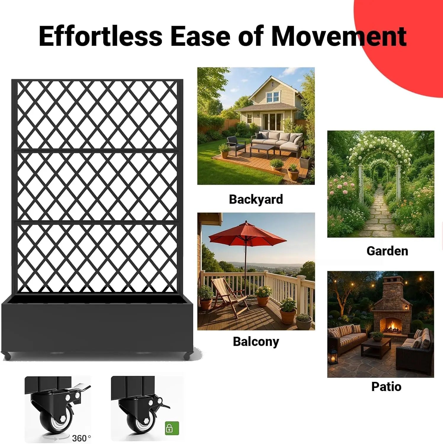 【Easy Mobility Planter Box】Designed for homeowners, gardeners, and outdoor enthusiasts, this planter box with wheels provides a stylish mobility plants trellis create a private retreat in your backyard. The locking wheels allow you to effortlessly reposition the planter to ensure your plants receive the optimal amount of sunlight and shade. No more heavy lifting or struggling with stationary planters.
