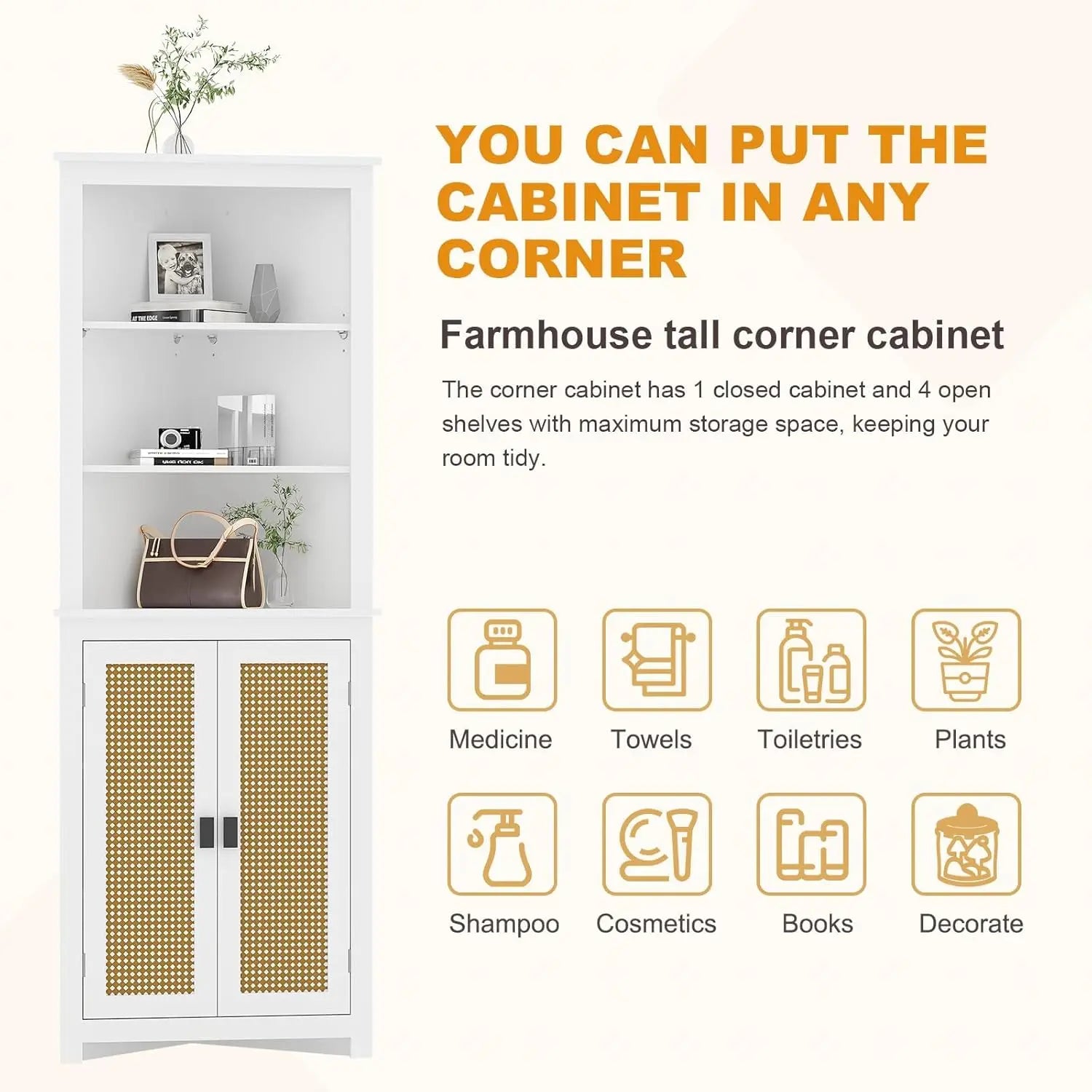 HiMISS Rattan Freestanding Corner Cabinet With 2 Doors Adjustable Shelves